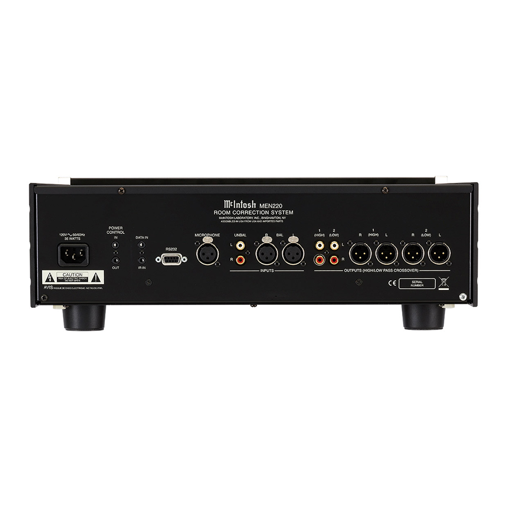 The McIntosh MEN220 is a sophisticated stereo room correction system designed to optimize audio performance in any listening environment. It integrates RoomPerfect™ Technology, which precisely analyzes room acoustics (up to 8 positions) using an included calibrated microphone to create a digital model, correcting frequency response anomalies without altering speaker tonality.