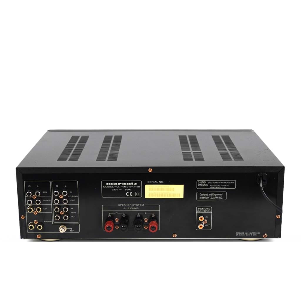Step up your audio game with this second-hand Marantz PM6010 OSE integrated amplifier. The “Original Special Edition” designation signifies various internal upgrades, including audiophile-grade components and a refined power supply, that elevate its sonic performance above the standard model.2 Delivering a robust 50 watts per channel into 3$8Omega$, this amplifier is known for its dynamic, engaging sound that pairs well with a wide variety of bookshelf and medium-sized floorstanding loudspeakers.4 Its low-noise, high-quality built-in phono stage (MM) makes it an excellent choice for vinyl enthusiasts seeking resale high-end audio value. This certified pre-owned Marantz amplifier is a perfect fit for the beginner or intermediate audiophile looking for a feature-rich, high-performance integrated unit that offers exceptional value and reliability. Explore our selection of certified pre-owned turntables to pair with its superb phono input.